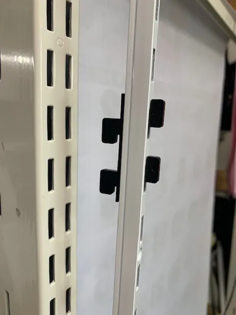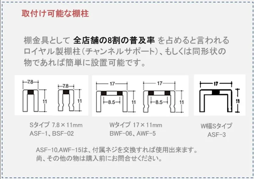 ※メモ:ロイヤル棚柱チャンネルサポートの色:ホワイトの上からスプレー缶にて壁色に合わせた塗装をすることで棚柱を壁面に溶け込ませ目立たなくできます。