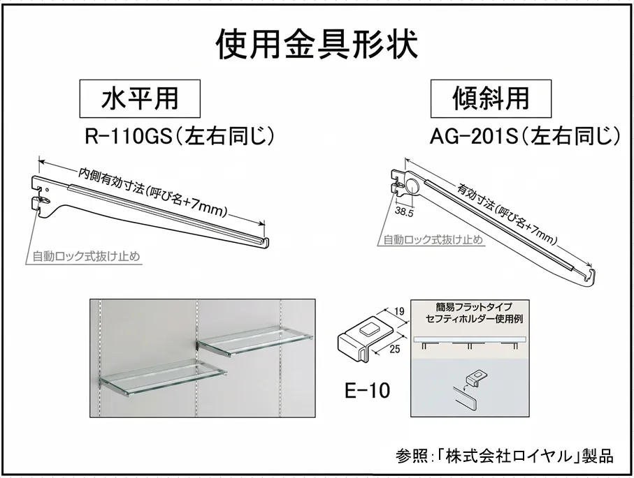 メモ:通常、ガラス棚板の内側に棚受け金具がある場合は、E-10は不要ですが、ガラス棚写真の様に棚受け金具が端端にある場合は、E-10(1個91円)2~4個を使用して下さい。